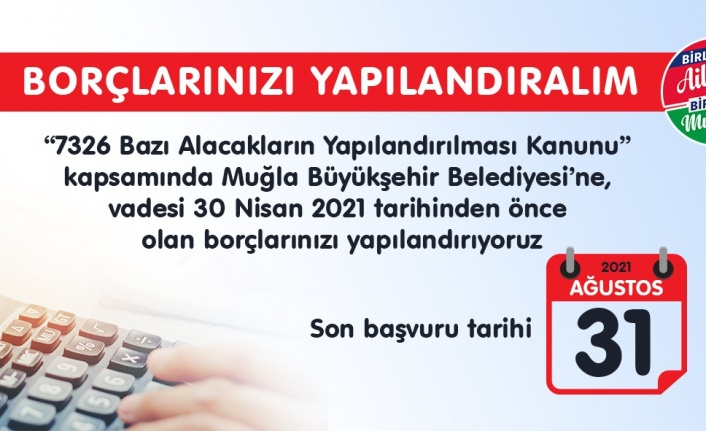 “7326 Bazı Alacakların Yapılandırılması Kanunu” kapsamında vadesi 30 Nisan 2021 tarihinden önce Muğla Büyükşehir Belediyesine borcu olan (Kira Borçları Hariç) vatandaşlara borçlarını yapılandırma fırsatı sunuldu.