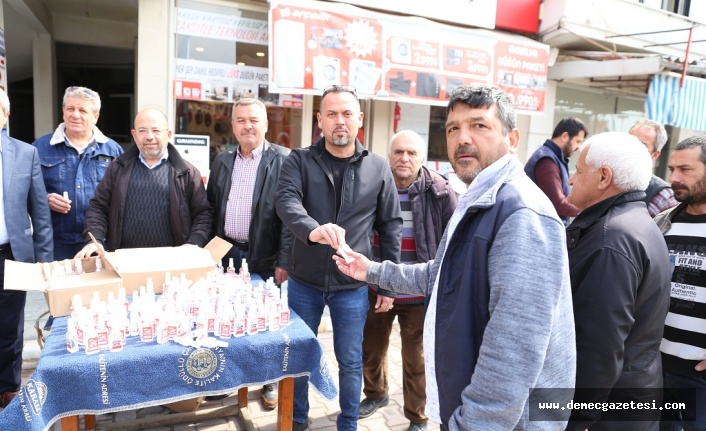 Yatağan ilçesindeki iki esnaf bir araya gelerek, vatandaşlara el dezenfektanı dağıttı.