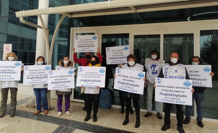 Muğla Sıtkı Koçman Üniversitesi (MSKÜ) Eğitim ve Araştırma Hastanesi önünde buluşan; Sağlık ve Sosyal Hizmet Emekçileri Sendikası (SES) Muğla Şubesi, Muğla Tabip Odası, Genel Sağlık İş Muğla Şubesi, Birinci Basamak Sağlık Çalışanları Birlik ve Dayanışma Sendikası, Muğla Ailesi Sağlığı Elemanları Derneği üyeleri, ellerinde “Sağlık ekip işidir”, ”Sağlık hizmeti bütündür, ayrıştırılamaz” yazılı dövizlerle basın açıklaması yaptı. Sağlıkçılar adına SES Muğla Şube Başkanı Nazlı Tepeli okudu.