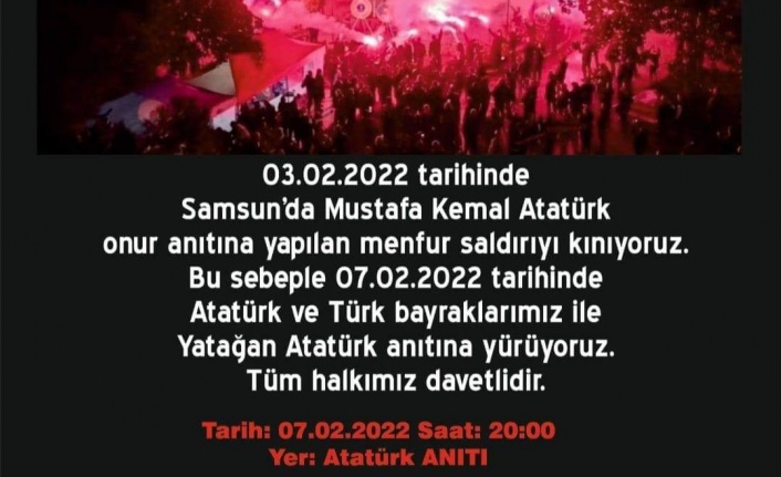 Yatağan ADD İlçe Başkan Yardımcısı Turgay Mutlu yaptığı duyuruda, "03.02.2022 tarihinde Samsun'da Mustafa Kemal Atatürk onur anıtına yapılan çirkin saldırıyı kınıyoruz. Bu sebeple 07.02.2022 tarihinde Atatürk ve Türk bayraklarımız ile Atatürk anıtına yürüyoruz. Tüm halkımız davetlidir” denildi.