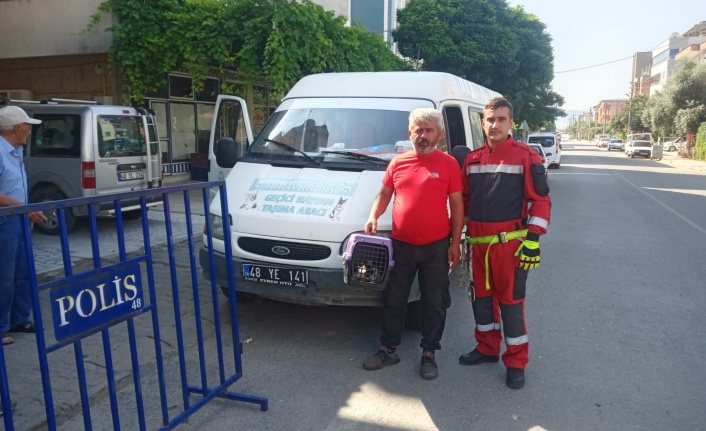 Mahalleye gelen Yatağan İtfaiye Amirliği ekipleri, merdiven aracılığıyla balkondaki kediye ulaşarak kurtardı.
