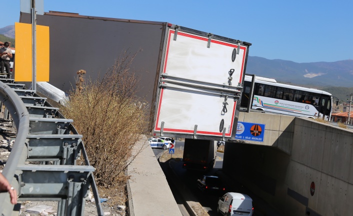 İzmir’den Yatağan’a gelen kamyon sürücüsü Yatağan giriş sapağındaki dört yolda virajı alamayıp bariyerleri aşarak devrildi. Sürüklenen Kamyonun yola düşmemesi büyük bir faciayı önledi.